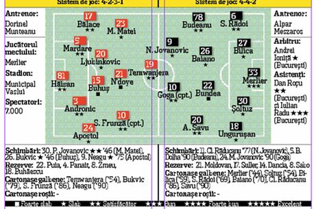 Dincolo de furia lui Porumboiu, meciul de la Vaslui a însemnat doar o zbatere în zadar a elevilor lui Dorinel Munteanu. Temwanjera, Frunză și Bukvic au ratat ocazii bune de poartă, în vreme ce Clujul a mizat pe cartea apărării, nereușind să amenințe în niciun fel poarta lui Hăisan. În minutul 85, jucătorii celor două echipe s-au încăierat în masă după un incident provocat de Claudiu Răducanu si Sorin Frunză.