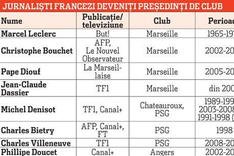 În Liga I, conducătorii marilor cluburi provin din foști arbitri, lucru care stârnește, mai ales acum, multe zâmbete. În Ligue 1, președinții grupărilor cu nume sunt aleși din breasla mult mai onorabilă a ziariștilor francezi. Una din mutările-șoc ale verii a fost înlocuirea lui Pape Diouf cu Jean-Claude Dassier în funcția de președinte al clubului Olympique Marseille. „Singurul președinte negru al unei grupări din Europa", așa cum se autointitula Pape Diouf, a fost jurnalist la „La Marseillaise", ulterior devenind agent de jucători și, în 2005, conducător pe „Velodrome". Dassier, înlocuitorul său, a muncit și el în presă, la postul de televiziune TF1. Patronul Robert Louis-Dreyfus este omul care face și desface la Marseille, iar predilecția sa de a-și lua colaboratori din rândurile presei are și un motiv. „Alegerea unor specialiști în comunicare pentru postul de președinte de club este un model viabil de administrare", a explicat un economist francez, Frederic Bolotay. OM a inițiat, de altfel, fenomenul, numindu-l la conducere pe Marcel Leclerc, întemeietorul publicației But! și președinte pe „Velodrome" în anii 60-70.