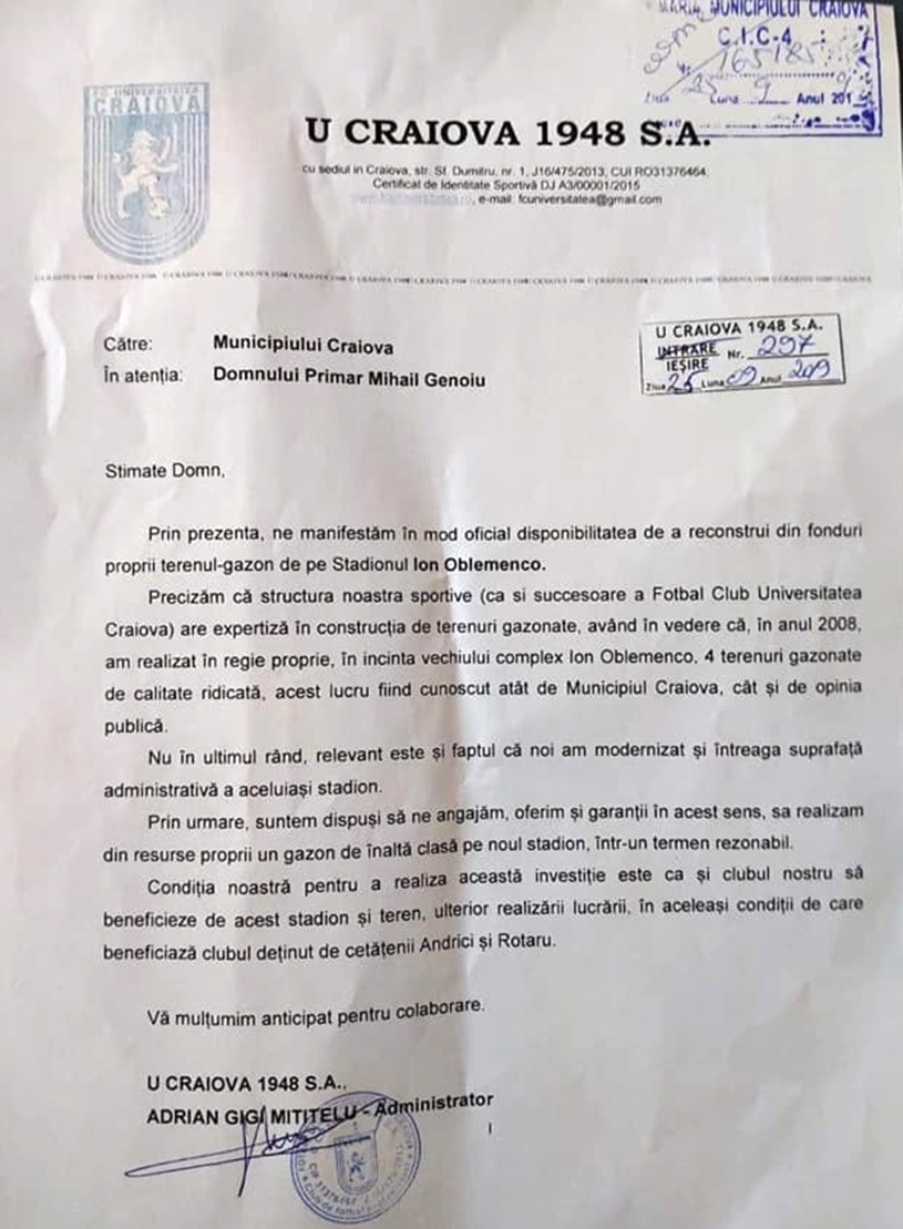 „Ne angajăm şi oferim garanţii în acest sens, să realizăm din resurse proprii un gazon de înaltă clasă pentru noul stadion, într-un termen rezonabil. Condiţia pebtru a realiza această investiţie este ca şi clubul nostru să beneficieze de acest stadion şi teren în aceleaşi condiţii de care beneficiază clubul deţinut de cetăţenii Andrici şi Rotaru”, precizează Mititelu în adresa către Primărie.