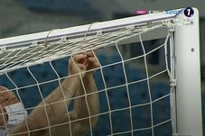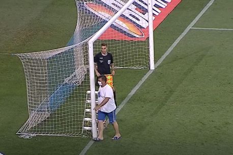 Probleme înainte de startul celei de-a doua reprize la meciul dintre Universitatea Craiova și FCSB. O bucată de plasă a porții la care apără Andrei Vlad s-a desprins, iar angajații din Bănie au găsit repede o soluție.