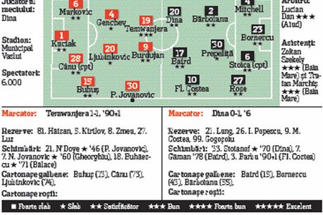 Vasluienii au încercat să spună o altă poveste în repriza secundă, însă norocul a fost de partea oltenilor, un picior providențial al lui Dorel Stoica scoțând mingea de 1-1 de pe linia porții. Elevii lui Moldovan au dominat apoi jocul, dar egalarea a venit însă când nici Porumboiu nu mai credea, în minutele de prelungire. Temwanjera a înscris dintr-o pasă primită de la Burdujan, aflat însă în poziție de ofsaid, iar visul Craiovei de a termina turul pe podium după 14 ani s-a spulberat.