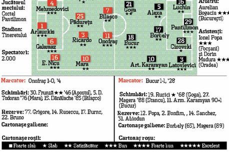 Fanii alb-violeți nu spuneți la TAS! – puteau chiar lua foc dacă Goga nu-l țintea pe Arlauskis. După o pauză în care fiecare a luat o doză de căldură pe unde-a apucat, mai „supărați” au ieșit tot ialomițenii. Minutul de aur a venit după o oră de joc, când Bilașco și Galamaz au irosit situații uriașe. Timișoara a mizat mai ales pe clasicul „Ai, n-ai mingea, tragi la poartă“. Și de data asta a mers cât pentru un egal care menține dilema. Nu am aflat aseară care este cea mai bună echipă a acestui tur de campionat. Oricum, contează doar cine se bucură după ultima etapă.