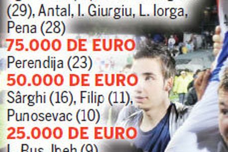 Fundașul dreapta al gălățenilor, Cornel Râpă, este fotbalistul cu cele mai multe prezențe în sezonul trecut, 33, pe locul doi aflându-se bosniacul Branko Grahovac cu 32 de jocuri, urmat de căpitanul Sergiu Costin, care a bifat 31 de partide. Cei trei se află printre fotbaliștii din lotul campioanei care vor încasa prima de 100.000 de euro. Fundașul sârb Milan Perendija a jucat doar 23 de partide și va încasa 75.000 de euro. La polul opus se află atacantul Robert Elek, cu șase prezențe, iar portarul Cristian Brăneț se va bucura cel mai puțin de prime, el evoluând doar un meci, pentru care va primi 4.000 de euro.