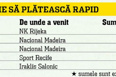 Criza de la Rapid nu-i afectează doar pe elevii lui Peseiro. Cluburile din străinătate de unde au fost aduși fotbaliștii își așteaptă acum rândul la bani. Despre ce este vorba? În momentul în care s-au făcut transferurile, părțile au convenit ca plata să fie făcută în tranșe, în decursul a mai multor luni. Cum de o bună bucată de vreme nimeni nu a mai adus bani la echipa alb-vișinie, giuleștenii se văd acum presați de partenerii de afaceri din vară. Aceștia au amenințat chiar că vor depune memorii la forurile superioare pentru a-și recupera banii. Un bun exemplu în acest sens sunt croații de la NK Rijeka, care trebuie să primească în aceste zile o nouă tranșă de bani din transferul atacantului Radomir Djalovic. Și cum DNA-ul a blocat conturile grupării din Grant, singura posibilitate de a plăti o reprezintă atragerea în Giulești a unui nou investitor.