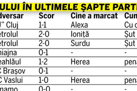 Ultimul gol marcat de Rapid din acțiune a fost în meciul cu Petrolul (2-0) din Giulești, la singura victorie obținută de elevii lui Răzvan Lucescu în 2012 în Liga I. Era etapa a XX-a, iar Rapidul încă mai spera la titlu. Romeo Surdu a închis tabela cu un 2-0 convingător, iar de atunci giuleștenii au luat-o la vale. În ultimele cinci partide pe care le-au disputat, patru în campionat și una în Cupa României, rapidiștii au reușit să marcheze doar două goluri, ambele din lovituri de la 11 metri, prin Herea. Nici măcar duminică, pe teren propriu, în fața unui Dinamo apatic, giuleștenii nu s-au descurcat mai bine în atac, lipsa unui om cu mintea limpede fiind parcă mai clară ca niciodată.