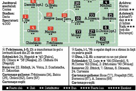După un minut însă, Mioveniul își bate joc de o șansă rarisimă, Bratu ratând cu poarta goală. Ocaziile se răzbună, clișeu vechi. Oltenii dau lovitura în minutul 81. Culmea, prin cel mai înjurat jucător de galerie, Dina. Putea câștiga la fel de bine și Mioveniul, dar Craiova s-a specializat să răstoarne scoruri și are meritul că nu a abandonat lupta. O noutate pentru greu-încercații fani olteni.
