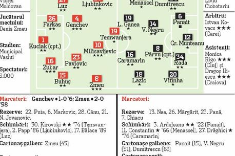 De cealaltă parte, gazdele încă mai speră la un loc în Europa League și asta s-a văzut în jocul lor, elevii lui Moldovan atacând de la un capăt la altul al meciului. După reușita rapidă a lui Genchev din minutul 6, același mijlocaș bulgar a executat foarte slab o lovitură de la 11 metri, iar Temwanjera a reușit să atragă asupra sa fluierăturile tribunelor la o fază de atac în care ar fi putut alege orice soluție în afară de cea a pasei direct în brațele portarului advers. Până la finalul primei jumătăți, "galben-verzii" și-au trecut în cont și o bară la un șut din întoarcere al lui Milisavljevic, oaspeții necontând în ofensivă.