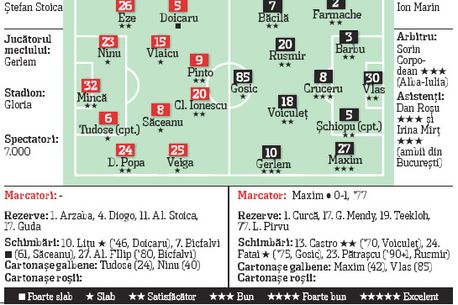 • min ‘8 – Voiculeț nimerește bara după o fază creată de Gerlem • min ‘45 – Cl. Ionescu șutează de la marginea careului puțin pe lângă vinclu • min. ‘54 – Maxim trage în Mincă din interiorul careului • 0-1, min. ‘77 – după o fază concepută de Gerlem, Maxim îl învinge cu un șut în vinclu pe Mincă