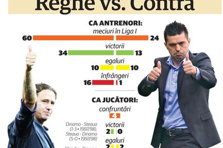Laurențiu Reghecampf și Cosmin Contra sunt doi foști fundași dreapta, unul care s-a consacrat la Steaua, celălalt la Dinamo și acum își dau prima bătălie în calitate de antrenori. Sunt tehnicienii momentului, „Guriță” având doar o singură înfrângere (0-2 la Mediaș) în cariera sa de antrenor în cele 24 de partide pe care le-a bifat în Liga 1 cu FC Timișoara și Petrolul, în timp ce Reghecampf a reușit să readucă Steaua în prim-planul fotbalului românesc și european. Culmea e că în ciuda rivalității celor doi din teren, Reghe și Contra au o relație destul de strânsă, ultimul fiind nașul de cununie al stelistului. Cei doi s-au născut în același an, 1975, Laurențiu fiind totuși mai mare cu trei luni față de Cosmin.