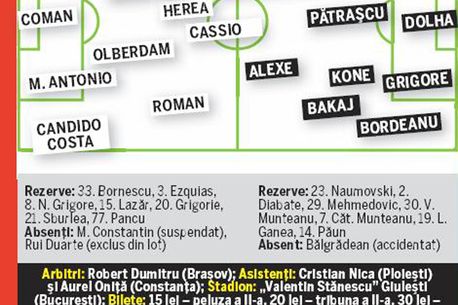 Rubio, Moți, D.Grigore, Diabate – Torje, Kone, Pătrașcu, Bakaj –