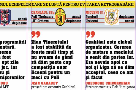 Astfel, înainte de etapa din weekend, un mare scandal s-a creat în jurul partidei Ceahlăul – Poli Timișoara. Ce s-a întâmplat mai exact? În primul rând, meciul a fost reprogramat pentru duminică, deși inițial trebuia să aibă loc vineri. Apoi, Kanal D a renunțat să mai televizeze jocul, având în vedere că tot duminică, și tot de la ora 20:30, va avea loc derby-ul Dinamo – Steaua. Ultima lovitură a venit din partea lui Marian Iancu, cel care a făcut o declarație șocantă: „La Piatra-Neamț, Dusan Uhrin ar putea folosi jucătorii care au evoluat mai puțin în acest sezon. Oricum, mie mi-ar părea rău ca Ceahlăul să retrogradeze”. Această succesiune de evenimente, dar și declarația finanțatorului bănățenilor, i-a indignat pe cei de la Mioveni, grupare aflată în luptă directă cu Ceahlăul pentru rămânerea în primă ligă.