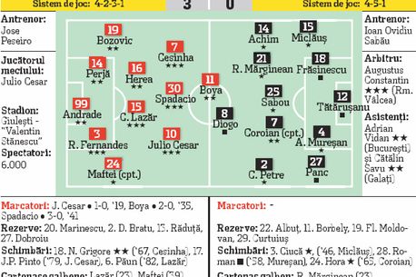 După pauză, spectacolul a continuat, jocul practicat de gazde ridicând publicul în picioare. Deocamdată, în Giulești toate sunt bune și frumoase, iar aseară aproape că nimeni nu și-a mai adus aminte de Rada, Pancu, Coman sau Marius Constantin. Oare însă Julio Cesar și Spadacio vor defila și în derby-uri, iar o apărare cu Maftei, fundaș dreapta, și Perjă în centru va rezista și în fața unor adversari adevărați? Iată o întrebare care își va găsi răspunsul în următoarele etape.