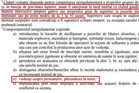Gestul iresponsabil al liderului de galerie o poate afecta serios pe Dinamo. Potrivit Regulamentului Disciplinar al Federației Române de Fotbal, clubul finanțat de Ionuț Negoiță este total responsabil pentru comportamentul propriilor fani, iar sancțiunile sunt importante. În articolul 82 – Responsabilitatea pentru comportamentul spectatorilor, la punctul 2 se precizează faptul că: „Clubul vizitator răspunde pentru comportarea neregulamentară a propriilor grupuri de suporteri și, în funcție de gravitatea faptelor, poate fi sancționat în mod similar cu clubul gazdă și/sau cu măsura interzicerii propriei galerii sau propriului grup de suporteri la jocurile disputate în deplasare sau pe teren neutru de la 1 la 10 jocuri”. Prin comportament neregulamentar, printre altele, se înțelege și pătrunderea suporterilor pe terenul de joc.