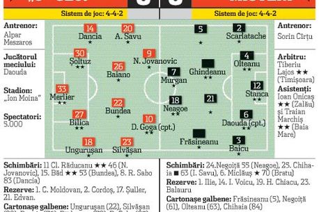 Cîrțu și-a parcat „autobaza“ în careul lui Stanca, iar alb-negrii s-au împiedicat în tranșee.Iar când elevii lui „Sorinaccio“ au fost depășiți, Savu și Jovanovic au ratat inexplicabil. Intrarea lui Claudiu Răducanu a adus incisivitate, dar nu și noroc în atacul “șepcilor”, “Blocnotes” și Bilica nimerind barele lui Stanca.