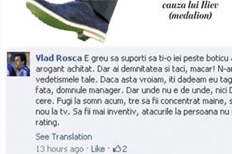 Conflictul dintre cei doi a luat amploare pe celebra rețea de socializare, oficialul Stelei și cel al Craiovei recurgând la ironii și chiar insulte. „Ești ultimul om din lume care ar trebui să vorbească de Iliev. Ai avut măcar bunul simț să-i ceri scuze după ieșirea ta vitează de acum doi ani? Când mai vorbești de Iliev să iei și niște lămâi pentru cei care te ascultă. Băi, ești cu cine vrei tu, nu cu mine, că nu am tras pe nas împreună„, a fost una din replicile lui Roșca. De partea cealaltă, Meme a punctat: „Trimite repede conversația la ziare și umflă-te combativ mic…te-am făcut vedetă pentru o zi, porcușor isteric.”