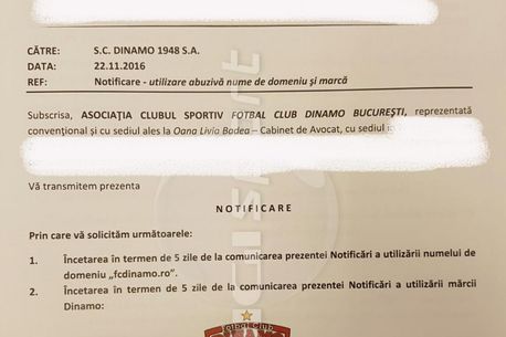 Mai mult de atât, oricine are dreptul de a redacta notificări, acest lucru neînsemnând că respectivele notificări sunt executorii, înainte ca o instanță competentă să pronunțe pe spețele invocate o hotărâre definitivă și irevocabilă”, e reacția oficială a clubului FC Dinamo.