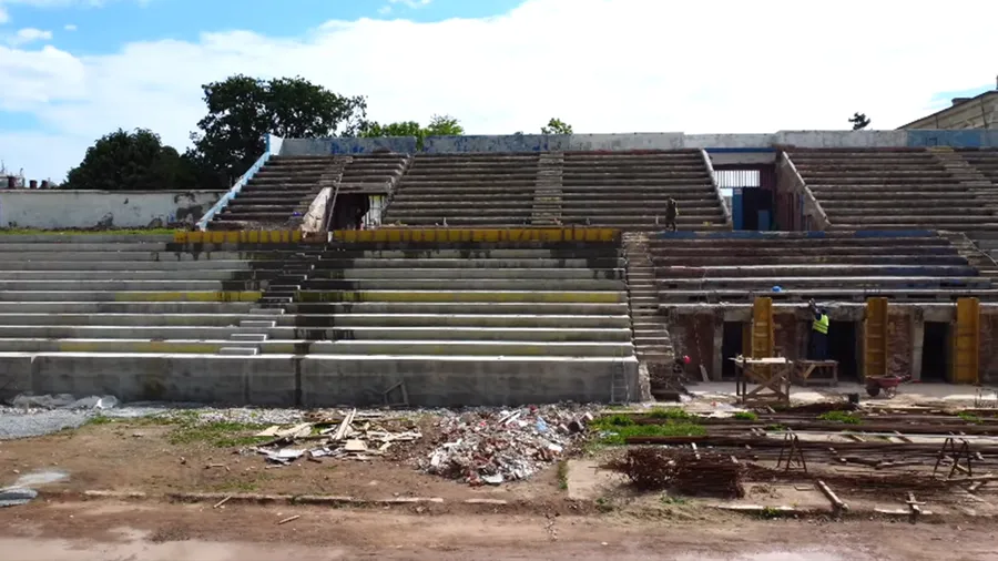 De săptămâni bune, optica a fost schimbată, în sensul că se pune accentul pe consolidarea tribunei vechi, care a rămas în picioare, și va avea o capacitate de aproximativ 4.500 de locuri, toate pe scaune. Dincolo, construcția tribunei noi s-a împotmolit printre proiecte cu probleme, avize și aprobări. Acolo nu s-a încheiat nici montarea stâlpilor care vor susține acoperișul, iar construcția clădirii vestiarelor este la stadiul de fundație, ca și la începutul anului.
