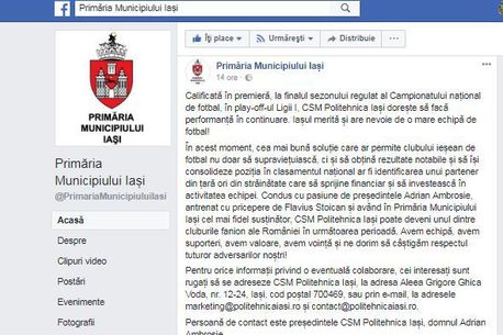 Acasa » Fotbal Intern » Liga 1 » Se leapădă Primăria și de fotbal? Anunț incredibil postat pe pagina de Facebook a municipalității ieșene