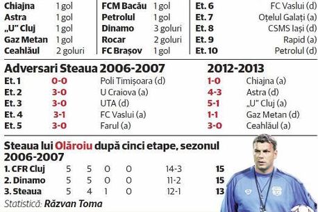 Performanța realizată de elevii lui Reghecampf este fără precedent în ultimii șase ani. Ultima dată când Steaua a avut o linie de clasament atât de bună după primele cinci meciuri a fost în sezonul 2006-2007, pe vremea când echipa era pregătită de Cosmin Olăroiu. În ciuda startului bun de atunci, Steaua a terminat pe locul doi, la șase puncte în spatele lui Dinamo!