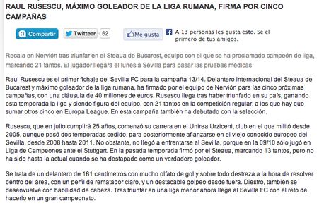 Clubul spaniol îi face și o prezentare lui Rusescu: „A triumfat în țara lui, câștigând campionatul și fiind principalul marcator al echipei, cu 21 de goluri în campionat, la care se adaungă alte cinci în Europa League. În acest sezon a debutat și la națională. Rusescu, care va împlini 25 de ani în iulie, și-a început cariera la Unirea Urziceni. (…) Are 1,81 metri, un simț bun al golului și, mai presus de toate, are un profil de marcator. Șutează bine și de la distanță și e bun și în jocul de cap. După ce a triumfat într-un campionat mic acum ajunge la Sevilla cu intenția de a se impune într-o ligă importantă”.