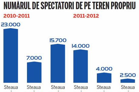 Anul trecut, Pițurcă umplea stadionul la meciul cu „U” Craiova. 23.000 de oameni erau prezenți la întoarcerea antrenorului în Ghencea. Anul acesta, Steaua a adunat în trei meciuri pe teren propriu doar 20.000 de oameni, deși jocul echipei este apreciat. Motivul este unul foarte simplu. În lipsa arenei din Ghencea, roș-albaștrii s-au reorientat către provincie, dar numărul mic de locuri de pe stadioanele pe care au jucat au făcut ca sumele venite din bilete să fie mult mai mici.