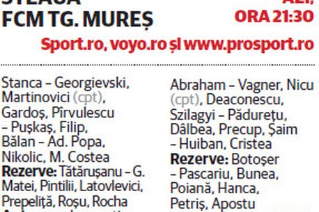 Steaua a avut parte de un început aproape perfect de sezon. Primul loc în campionat și calificarea în grupele Europa League sunt performanțele care le dau încredere elevilor lui Reghecampf că pot aduce titlul cu numărul 24 în vitrina cu trofee a clubului. Cu toate acestea, Steaua are o deplasare foarte grea duminică, zi în care va juca contra Petrolului pe „Ilie Oană”, într-o atmosferă incendiară. În acest sens, Reghe va odihni în partida de azi, cu FCM Tg. Mureș (Cupa României), mai mulți dintre titularii obișnuiți și va încerca să trimită în meciul cu prahovenii o echipă capabilă să treacă peste atmosfera ostilă din tribune și care să învingă la Ploiești.