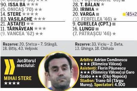 90. Issa Ba, 14. Stere (cpt), 83. Vasilache – 21. Astafei, 11.