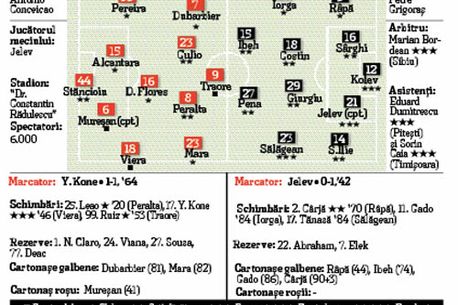 În zece oameni, „feroviarii“ au intrat însă în joc în partea a doua. Kone, intrat la pauză mai mult într-un picior, a replicat pentru 1-1 (64) și a schimbat ritmul „feroviarilor“ executați la vestiare de un Iuliu Mureșan dezlănțuit. Oțelul s-a trezit la ocazia lui Giurgiu, din șase metri peste poartă, apoi clujenii și‑au pus mâinile în cap la ratarea uriașă a lui Ruiz (81), nedemnă de un compatriot cu Maradona.