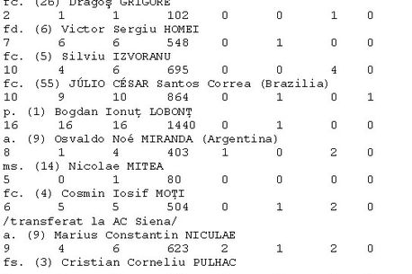* Au fost rezerve fără a intra în joc: de 9 ori – E. Nae; 8 – Kajcsa; 6 – I. Voicu; 5 – N. Constantin, B. Nicolae; 4 – D. Zaharia; 3 – Bălțoi, M. Cristescu, Fabinho, Hadnagy, Senin; 2 – Abrudan, C. Dedu, Cr. Ionescu, Mateiu, Oros, Sburlea; 1 – Rui Duarte, Ezequias, C. Munteanu, Paulo Adriano.