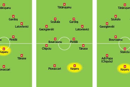 Cea mai probabilă dintre ele e cea în care Keșeru va juca în locul lui Stanciu, în spatele lui Piovaccari. Reghecampf va merge pe sistemul consacrat 4-2-3-1. Fotbalistul lui Bastia are calitățile lui Stanciu, dar poate fi mult mai precis la finalizare. A fost utilizat la Bastia ca al doilea atacant în spatele vârfului în meciul cu Valenciennes, scor 2-0.