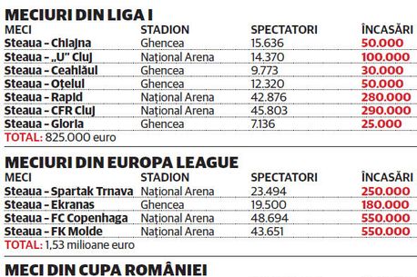 Cele mai mari încasări de până acum au fost adunate, firesc, de meciurile din Europa League cu FC Copenhaga și FK Molde, atunci când au venit la meci 48.695, respectiv 43.651 spectatori. Cu aproximativ 1,1 milioane de euro adunați până acum în partidele importante din Europa, Steaua a mai beneficiat și de două derby-uri „generoase”. 42.876 de spectatori cu Rapid și 45.803 cu CFR Cluj au mai generat venituri cumulate de aproape 600.000 de euro. În aceste condiții, totalul sumei aduse în club de spectatori ar putea ajunge la 3,5 milioane de euro până la finalul turului, după ce roș-albaștrii vor primi vizita lui Dinamo și a nemților de la VfB Stuttgart. Premisele sunt încurajatoare după ce până acum s-au vândut 27.900 de bilete online pentru marele derby, de pe 4 noiembrie.