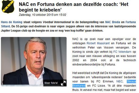 Informația apare într-o știre care anunță că NAC Breda și Fortuna Sittard se luptă pentru semnătura lui Hans de Koning: „De Koning a refuzat în ultimele luni, din diferite motive, oferte de la FC Emmen, NEC, Steaua București și FC Lisse”, notează cei de la voetbalzone.nl. „De trei luni stau acasa. Nu mă plictisesc, dar mă gândesc să revin. Aștept să văd ce se întâmplă”, a decarat Hans de Koning.