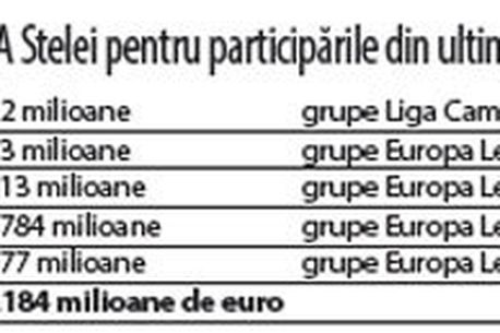 Din 2009 și până în prezent, Steaua a avut 4 prezențe în grupele Europa League și una în cele ale Ligii Campionilor –  cea mai generoasă competiție din punct de vedere financiar.  Cele 4 participări în grupele Europa League au însemnat bonusuri totale de 12,9 milioane de euro, în timp ce un singur sezon jucat în Liga Campionilor i-au asigurat un premiu oferit de UEFA de 15,2 milioane de euro. Acești bani reprezintă strict sumele pe care UEFA le acordă pentru rezultatele din cupele europene. N-au fost luate în considerare veniturile din bilete sau publicitatea de pe stadion.