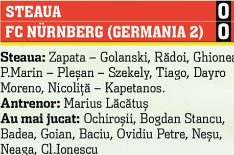 Roș-albaștrii au contat doar în prima parte. Steaua a disputat aseară în localitatea Schwarzach, ultimul meci amical al stagiului de pregătire de la Flachau în compania echipei proaspăt retrogradate în liga secundă germană, FC Nürnberg. Antrenorul Marius Lăcătuș a aruncat în luptă cel mai bun „11” în viziunea sa pentru noul sezon. Prima repriză a fost la discreția Stelei, care a ratat rând pe rând deschiderea scorului prin Pleșan (minutul 10), Kapetanos și Szekely (19,41) și Nicoliță (41). Nemții au avut și un om eliminat după intrarea dură a lui Masmanidis asupra lui Szekely, însă el a fost înlocuit imediat cu un alt coechipier. După reluare, „Fiara” a schimbat liniile, astfel că jocul roș-albaștrilor nu a mai fost același. Chiar și așa, FC Nürnberg a fost la un pas să-și marcheze un autogol de senzație în minutul 67, stârnind râsul lui Gigi Becali.