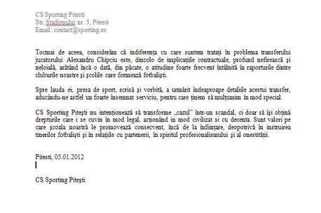 Conducerea Clubului Sportiv Sporting Pitești, școală privată de fotbal, dorește să aducă la cunoștința opiniei publice o serie de aspecte foarte importante privind transferul fotbalistului Alexandru Chipciu, întrucât, în controversele iscate pe această temă, informațiile furnizate de reprezentanții săi și declarațiile acestora au fost uneori denaturate sau interpretate tendențios.