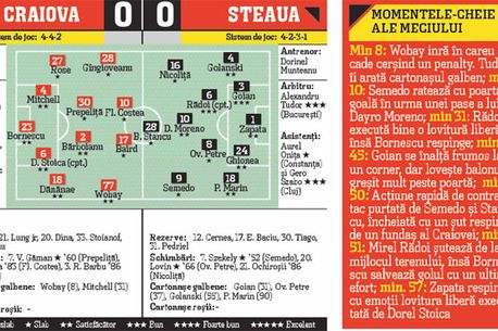 După ce în etapa trecută, reușita sa în meciul cu Timișoara a scăpat Steaua de o înfrângere, căpitanul Stelei marcând golul de 2-2, aseară, Mirel Rădoi ar fi putut înscrie încă o dată, de această dată foarte spectaculos. În minutul 51, căpitanul Stelei l-a văzut ieșit din poartă pe Pepe Bornescu și a încercat să îl surprindă pe portarul oltean, șutând extraordinar de la 50 de metri. Goalkeeperul Craiovei s-a repliat și a reușit inextremis să respingă mingea de sub bară, evitând astfel un gol care ar fi putut să fie desemnat cel mai frumos al acestui sezon.