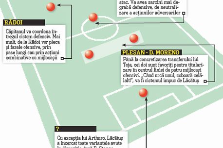 „Am învățat de la Hagi cât de important este axul central într-o echipă de fotbal”, spunea Gigi Becali în urmă cu ceva timp. Ideea finanțatorului nu avea cum să nu-l influențeze și pe Marius Lăcătuș, care a pus la punct un sistem de joc, 4-1-4-1, din care se evidențiază clar închizătorul și vârful împins. Pornind de la Zapata și continuând cu Rădoi, Ovidiu Petre, Pleșan și Dayro Moreno, antrenorul Stelei a conturat deja coloana vertebrală a echipei, cu o singură excepție. Este vorba de identitatea atacantului de careu, acel număr 9 care va trebui să valorifice acțiunile de atac ale întregii echipe.