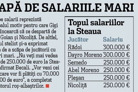 Într-o perioadă în care este afectat de lipsa de lichidități, Gigi Becali speră să redreseze bugetul Stelei prin vânzările celor mai importanți jucători. De acest lucru se ocupă personal vărul finanțatorului din Ghencea, Giovanni Becali. „Sunt trei fotbaliști de la Steaua care pot pleca în această iarnă”, a precizat impresarul, menționându-i doar pe doi dintre aceștia. „Pe Goian s-ar putea încasa patru milioane de euro. De asemenea, Rădoi valorează între opt și zece milioane, chiar dacă banii vor veni în mai multe rate”, a menționat Giovanni Becali. „Deocamdată sunt doar discuții. Aștept ofertele concrete”, a spus ieri patronul Stelei.