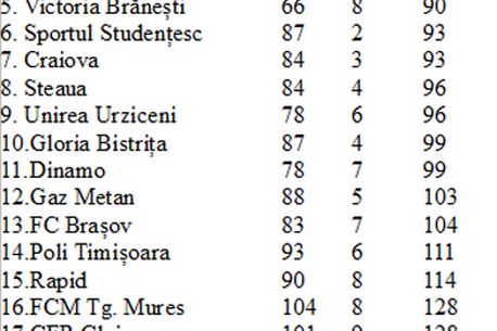 Steaua și Dinamo se zbat la mijlocul clasamentului, cu 96,