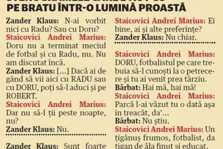 Gigi Becali a anunțat ieri că l-a transferat pe Doru Bratu de la Concordia Chiajna. Nimic spectaculos în această informație. Dar faptul că numele fotbalistului apare în stenograme în care se vorbește despre o rețea care racola bărbați tineri pentru a întreține relații sexuale este ieșit din comun. Mai ales că în urmă cu doi ani Gigi Becali spunea că la Steaua nu va juca un fotbalist despre care s-a spus că este homosexual. „Nici dacă se desființează Steaua nu iau un homosexual în echipă. Zvonurile sunt zvonuri… Poate că e minciună că e homosexual. Dar dacă e adevărat? Decât un gay, mai bine jucăm cu un junior”, spunea finanțatorul roș-albaștrilor la acea vreme despre Ivanov, un fotbalist bulgar pe Stoichiță dorea să-l transfere.