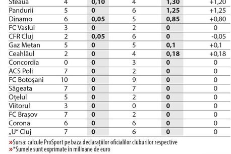 Potrivit aceleiași surse, sezonul trecut a fost profitabil pentru fotbalul românesc. Media cheltuielilor pentru transferuri la nivelul Ligii I a fost de 641.518 euro, în timp ce media încasărilor de pe urma transferurilor de jucători a fost de 1.486.496 milioane euro. Cel mai mare încasator al Ligii I în sezonul 2012/2013 a fost clubul CFR Cluj. Ardelenii au vândut fotbaliști în valoare de 10,.4 milioane de euro și au cumpărat de numai 2,14 milioane. La polul opus s-a situat Steaua București, club care începea lupta pentru cucerirea titlului de campioană cu investiții de 3,9 milioane euro în jucători, totul în condițiile în care vânzările au adus în conturi doar 100.000 de euro.