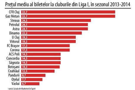 În România este o situație atipică, în primul rând din cauza faptului că pentru a vedea un meci de Liga 1 nu este scump. Conform unui studiu asupra sezonului trecut făcut de Școala de Marketeri în Sport dezvoltată de SEG Team în parteneriat cu Facultatea de Marketing din ASE, prețul mediu al unui tichet la meciurile din campionatul intern a fost, în campionatul 2013/2014, doar 17 lei. Surprinzător, Gaz Metan Mediaș și CFR Cluj sunt cluburile cu cele mai mari prețuri, adică aproximativ 33 lei. La polul opus s-a aflat FC Vaslui, unde pentru a vedea meciurile echipei din localitate te costa, în medie, aproximativ 7 lei.