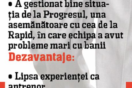 Cele două simboluri ale Rapidului au cele mai mari șanse să preia echipa. La ședința Consiliului de Administrație de aseară s-a discutat printre altele și despre viitorul antrenor al vișiniilor. În pole-position sunt Marius Șumudică și Marian Rada, ambii fiind considerați simboluri ale echipei din Grant. Șumi și-a încheiat recent conturile cu Progresul, echipa din Parcul cu Platani confruntându-se cu grave probleme financiare. Șumi a avut un parcurs bun în prima parte a sezonului la cârma „bancarilor“, terminând turul pe locul doi, la două puncte în spatele liderului Ceahlăul. Chiar și președintele Ligii, Dumitru Dragomir, a făcut lobby pentru Șumudică: „Copos să-l pună pe Șumudică și eu răspund de rezultate dacă îl pune. E un om serios și ambițios. Aș merge pe mâna lui”. O altă variantă pentru banca tehnică o reprezintă actualul antrenor al celor de la Rapid II, echipă aflată pe locul doi în seria ei din Liga a III-a, Marian Rada, care a mai pregătit Rapidul în campionatul trecut, timp de nouă etape după ce Mircea Rednic și-a prezentat demisia.