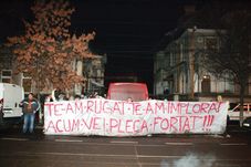 Un grup de fani rapidiști s-a strâns aseară în fata sediului PRO TV pentru a protesta împotriva lui Copos, care se afla la Informația. „George Copos, unde ești? Afară din Giulești!”, au strigat suporterii. „Te-am rugat, te-am implorat, acum vei pleca forțat”, se putea citi și pe un banner (foto) .