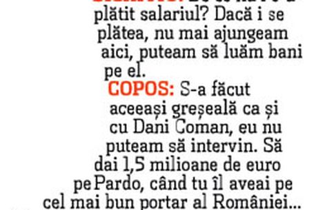 Patronul de la ANA nu înțelege cum de Rapid a cheltuit 20 de milioane de euro în doar câteva luni, iar în Giulești au fost aduși jucători cu salarii de 480.000 de euro. Fără să dea nume, Copos i-a arătat cu degetul pe Constantin Zotta și Jose Peseiro. „Am cheltuit, de fapt ei au cheltuit 20 de milioane de euro, în 2008. Nu asta e foarte grav totuși, ci faptul că s-au făcut niște contracte de milioane de euro, care nu cred că pot fi respectate. Am plătit pentru Peseiro pe șase luni 1.200.000 de euro. S-au adus jucători cu câștiguri anuale de 480.000 de euro. Aici este greșeala cea mare”, a tunat Copos.