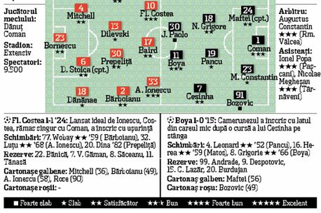 Oltenii au început jocul zglobiu, avântat, încercând să lovească repede în fața unui Rapid care încă încerca să se acomodeze cu gazonul prost. Și, în timp ce gazdele încercau să aducă în realitate trasee virtuale ale mingii, Rapidul a răspuns prin pragmatism. La primul atac consistent, Cesinha a pătruns pe dreapta și a centrat la Boya, care nu l-a iertat pe Bornescu.