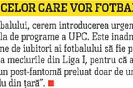 „Este inadmisibil ca abonații UPC să nu poată avea acces la meciurile din Liga I! Vă rugăm să luați măsuri, domnilor de la UPC și din trustul Intact (părinții gsptv-ului)!”. Aceasta este linia pe care merg cei care nu mai pot vedea partidele din Liga I la TV. Părerea de mai sus este semnată „szasz eduard” și a fost exprimată pe site-ul www.petitieonline.ro. Eduard a făcut mai mult decât să-și posteze nemulțumirea, înaintând o petiție online adresată celor care, din rațiuni comerciale, au limitat sever expunerea TV a fotbalului intern. Această petiție a fost semnată, până ieri, la ora 20:00, de 617 suporteri nemulțumiți.