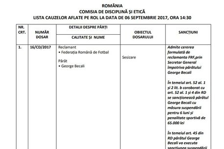 Comisia de Disciplină a FRF a dictat o pedepasă de 6 luni de suspendare pentru Gigi Becali pentru declarațiile la adresa forului condus de Răzvan Burleanu, dar și pentru comentariile rasiste făcute la adresa lui Wilfred Moke și Sulley Muniru.