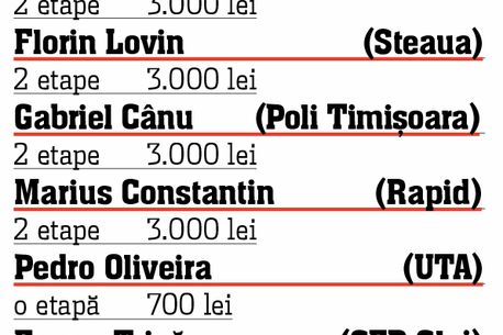 Pentru intrările violente asupra adversarului în timpul meciurilor din ultima etapă a Ligii I, jucătorii Sandberg, Lovin, Oliveira, Cânu și Marius Constantin vor sta câte două runde, deși nu au văzut cartonașul roșu. S-a considerat că arbitrii au greșit când nu i-au eliminat pentru faulturile grosolane făcute. Aceste decizii constituie o premieră, întrucât s-au sancționat fapte care au fost observate de centrali, dar nu s-a luat măsura care se impunea. Sancțiunile nu sunt atacabile la Comisia de Apel, întrucât, conform Regulamentului Disciplinar, pedepsele mai mici de două etape inclusiv sau o lună de suspendare nu mai pot fi atacate cu recurs.