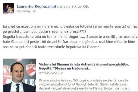 În ziua partidei cu Viitorul lui Gică Hagi, Reghecampf și-a concentrat atenția pe acuzele făcute de Negoiță. Încă de dimineață, la ora 9:37, Reghecampf a ținut să îi răspundă lui Negoiță prin intermediul contului oficial de Facebook (captură foto jos). Reacția antrenorului a provocat o alta, la fel de dură, din partea dinamovistului, moment în care Reghecampf și-a mutat discursul la TV. Mai precis la Dolce Sport, acolo unde a intervenit în direct cu 4 ore înainte de startul meciului cu Viitorul pentru a-i răspunde lui Negoiță. Evident afectat de cele întâmplate, Reghecampf și-a concentrat discursul de la finalul meciului câștigat cu echipa lui Hagi doar în jurul finanțatorului dinamovist. „E deranjant că unii ne bagă în lucruri necurate. E păcat că și Hagi e bănuit de tot felul de prostii după ce a investit enorm în fotbalul românesc. În iarnă vor veni mai mulți jucători, inclusiv de la Dinamo, că tot a anunțat Negoiță că oricine e de vânzare. Eu voi rămâne la Steaua, deși nu e simplu sa fii antrenor aici„, a spus antrenorul Stelei în conferința de presă. În final, Reghecampf a recunoscut dificultatea în care se află tocmai din pricina situației în care se găsește patronul: „Acest om (n.r. – Ionuț Negoiță) nu ar fi avut curajul ăsta să atace Steaua dacă era patronul nostru în libertate„.